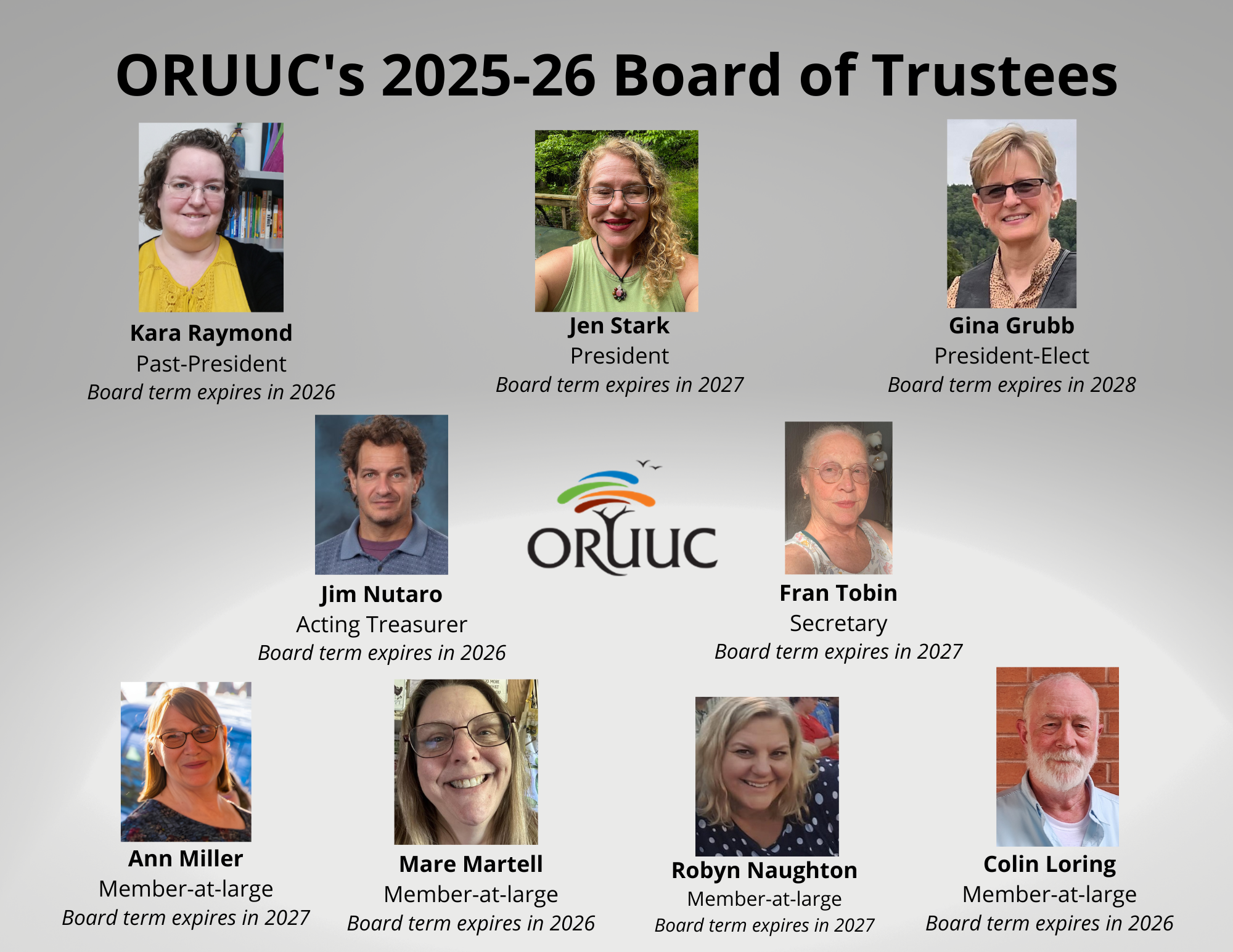 On the first Sunday of each month, a board member will be available in the lobby/portico during second hour for conversations. To contact the Board, email President@oruuc.org.