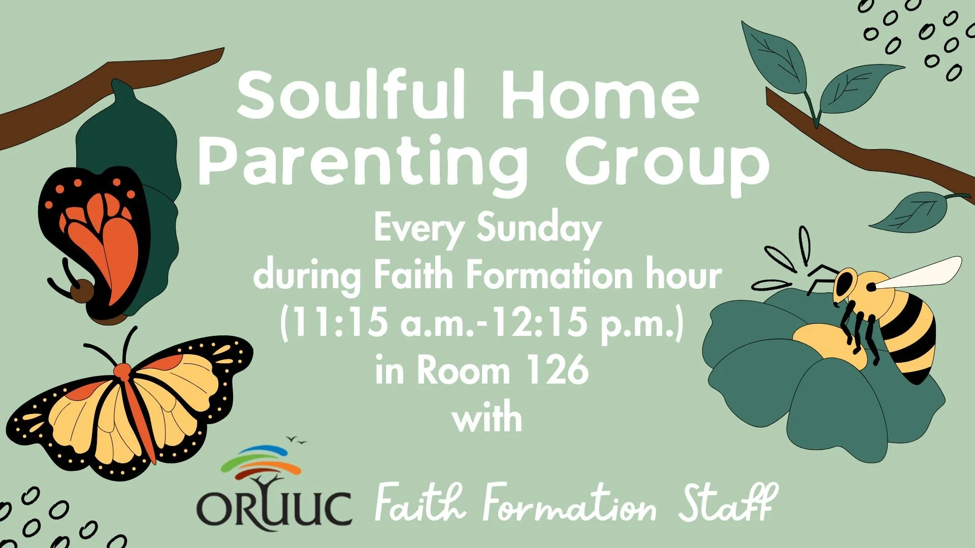 Each week, a different member of the Youth Faith Formation Staff will be in Room 126 during 2nd Hour to discuss ways to integrate Faith Formation into your home and daily lives. Each month begins with Christine Rehder, Director of Faith Formation, introducing the monthly Soul Matters theme. In the following weeks of the month, our YFF Staff will incorporate the theme into discussions relevant to each age group. Parents of children and Youth of all ages are encouraged to come and share their wisdom and experience of every age.