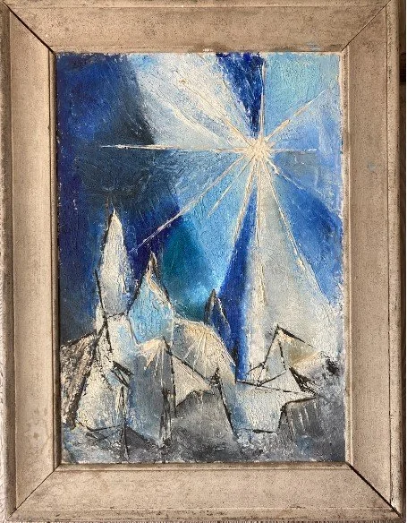 Nancy was 18 when she made this painting, and we think she must have been inspired by playing The Planets in one of the orchestras at the Eastman School of Music. At Eastman, she participated as a secondary student and had been taking cello lessons from professors there, beginning as a three-year-old starting out on piano in the preparatory school.