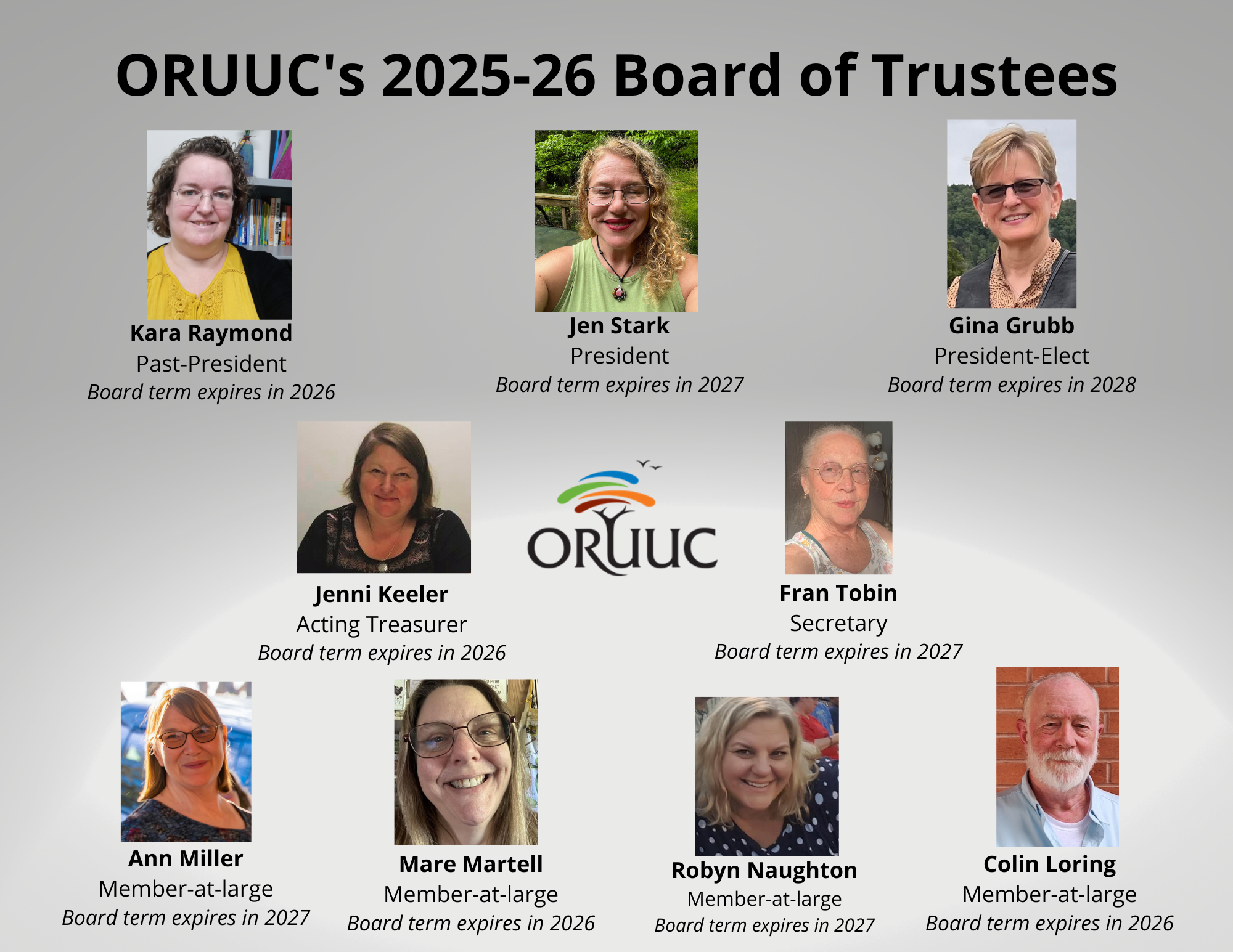 On the first Sunday of each month, a board member will be available in the lobby/portico during second hour for conversations. To contact the Board, email President@oruuc.org.